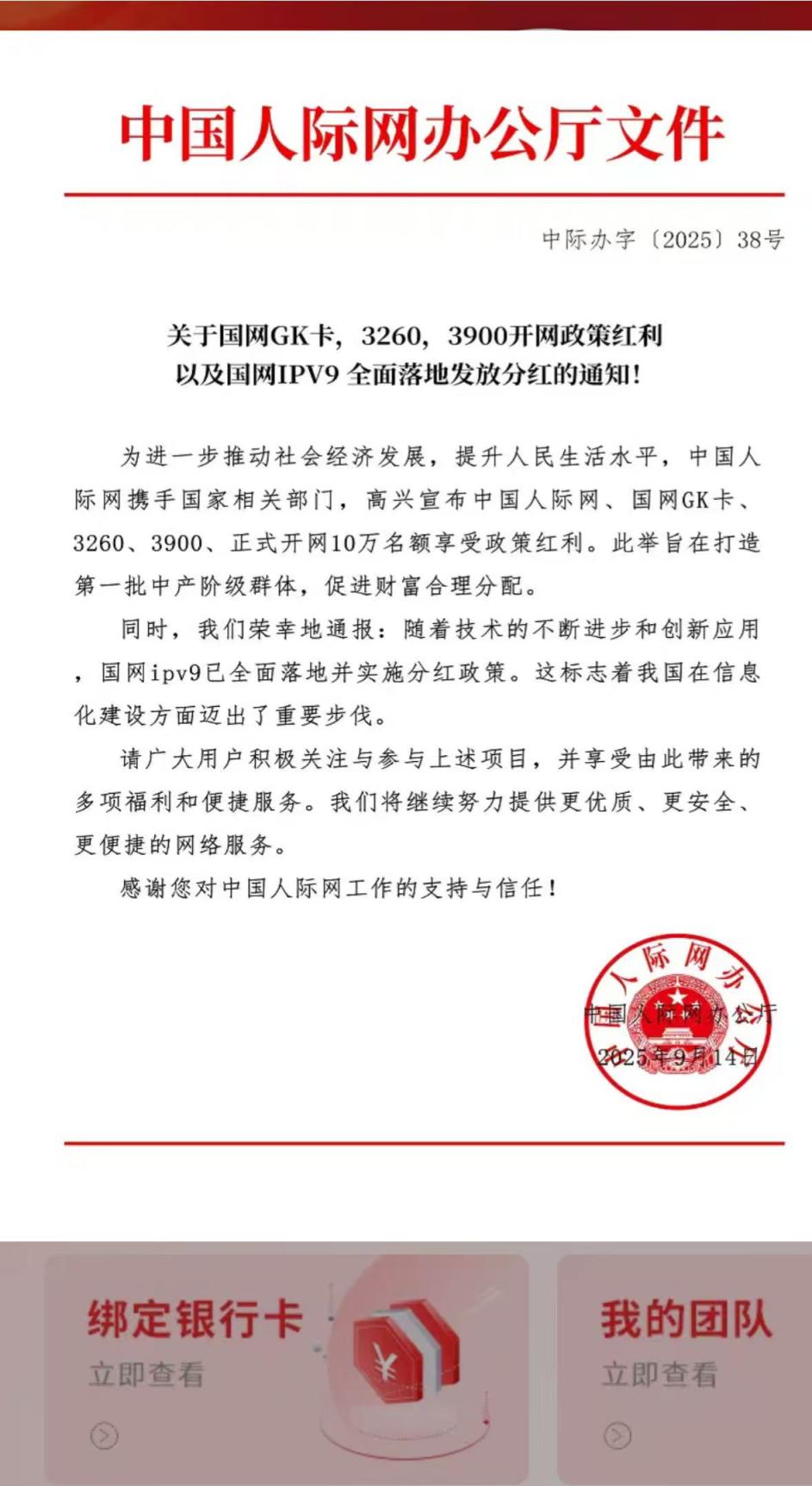 紧接着,是一份落款为“中国人际网办公厅”的红头文件。称“携手国家相关部门,为参与正式开网的10万名客户提供政策红利,打造第一批中产阶级群体,促进财富合理分配。”
